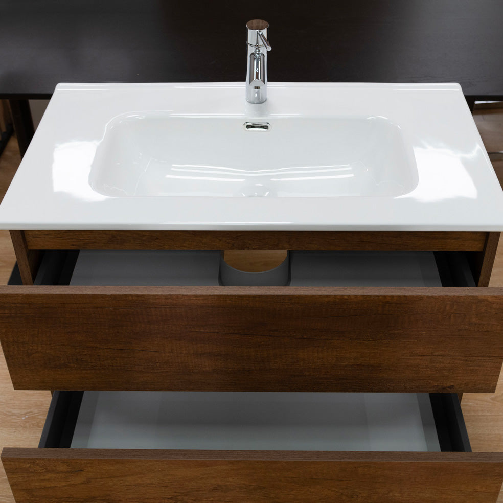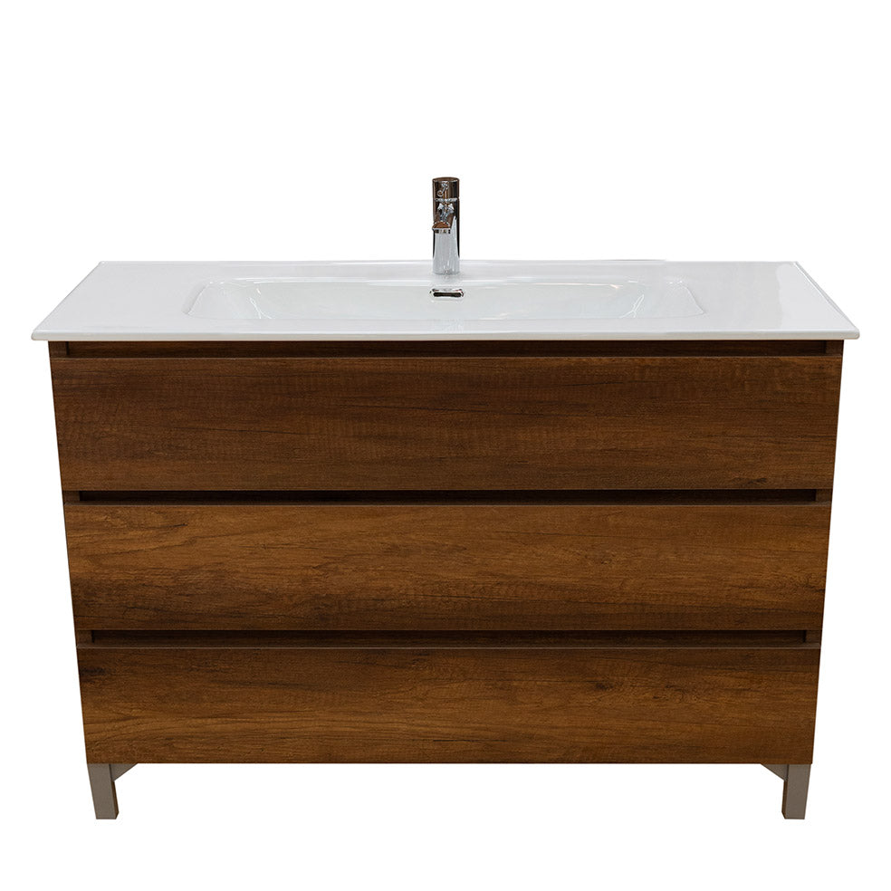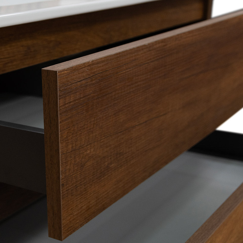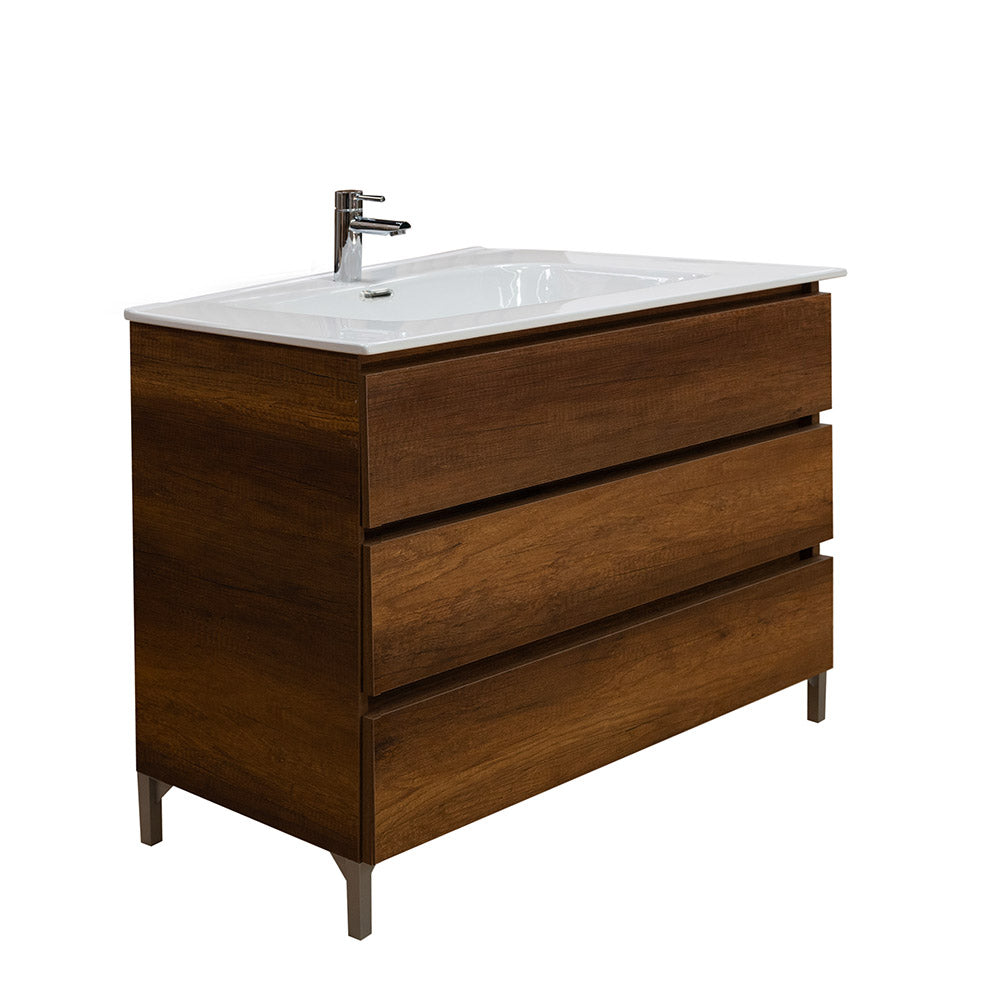 Il mobile bagno a terra da 100cm in legno nobilitato con finitura in noce è la scelta ideale per chi desidera un bagno accogliente e sofisticato. Il calore delle venature effetto legno si unisce alla praticità dei 3 cassetti soft close, del lavabo integrato in ceramica bianco lucido e dei piedini in argento satinato, creando un mobile che coniuga tradizione e modernità.