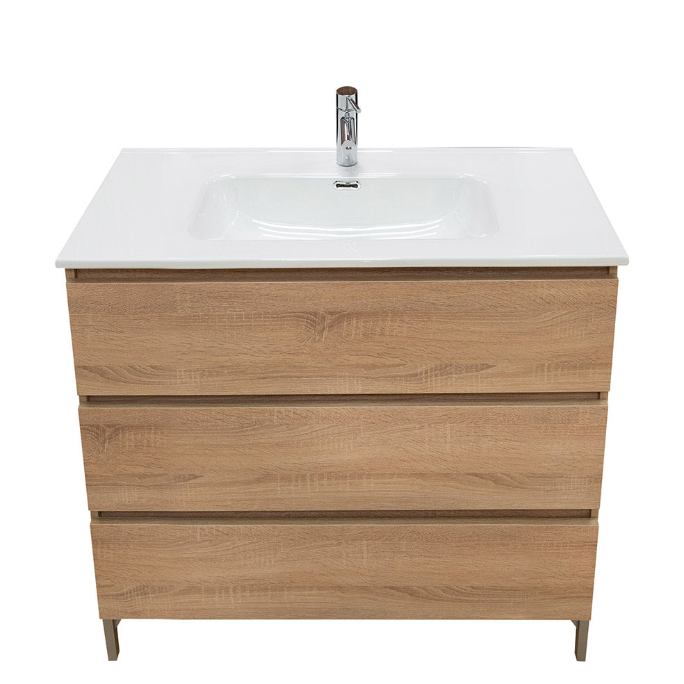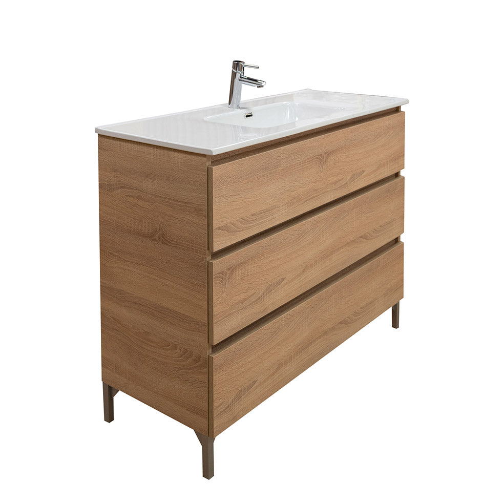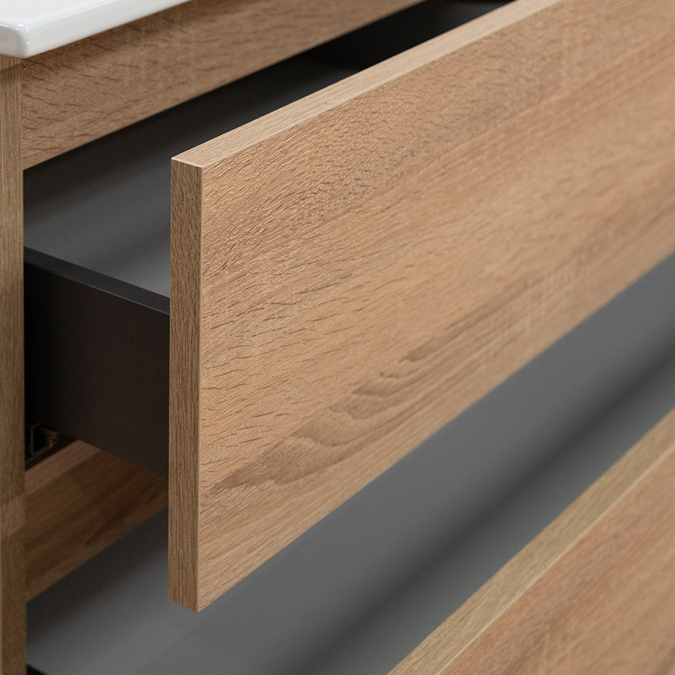 Il mobile bagno a terra da 100 cm in legno nobilitato con finitura in rovere americano unisce il fascino del legno naturale a linee moderne e pulite, rendendolo la scelta perfetta per chi cerca un arredo bagno accogliente e contemporaneo.